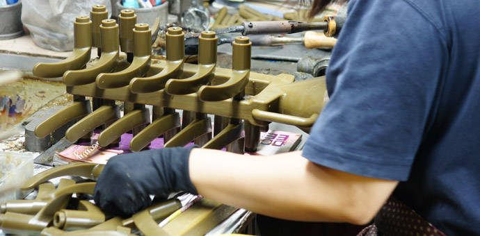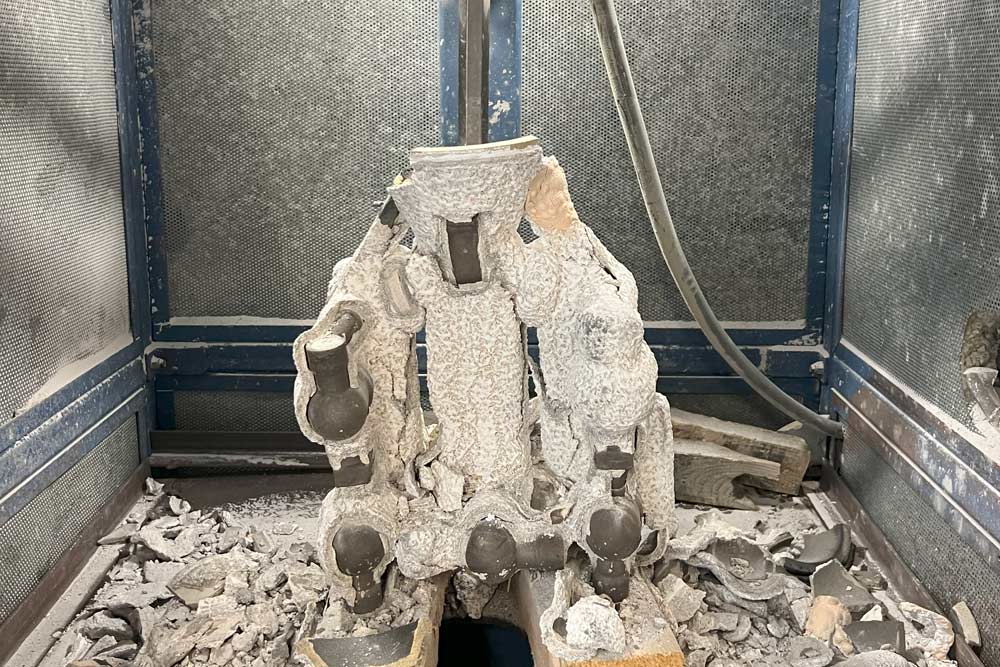 Gates and risers are cut from the individual castings.